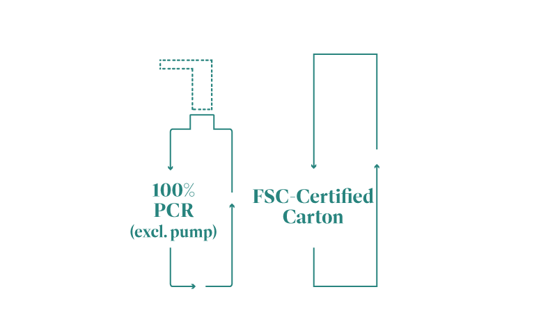 Our packaging uses 50–100% post-consumer recycled plastic, FSC-certified paper, soy-based inks, and water-separable labels to support cleaner recycling streams
